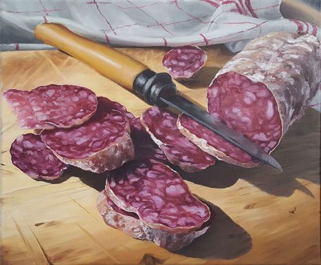 Nilcé est une artiste clairement réaliste : quand elle peint une assiette de crêpes, le tableau fait venir l’eau à la bouche. Dans une précédente exposition, elle a déployé face à face des nourritures, fromages ou saucissons, œuf à la coque ou madeleines, rosbif cuit à point, et les animaux de la ferme qui sont la source première de nos agapes. Histoire de ne pas se nourrir d’illusions, de mettre le nez dans la réalité, et de remercier ces bêtes qui nous font vivre. Elle a fait le portrait de vaches, d’oies, de chats, de chevaux ou de chiens où leur propriétaire les reconnaît parfaitement. Si elle s’amuse à représenter ces personnages qui ne se regardent ni dans la glace ni en image, il va de soi qu’elle s’intéresse au visage humain, à ses expressions, et ces derniers temps à des frimousses d’enfants.
